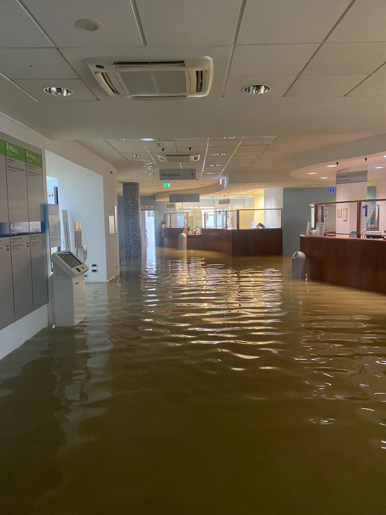 A Ravenna e provincia la situazione resta grave. Oggi attorno a mezzogiorno è stata disposta l’evacuazione delle abitazioni nella zona dei canali consortili. A Cotignola di Lugo pesanti allagamenti: sott’acqua anche un’importante struttura sanitaria, il Maria Cecilia Hospital (foto in basso).