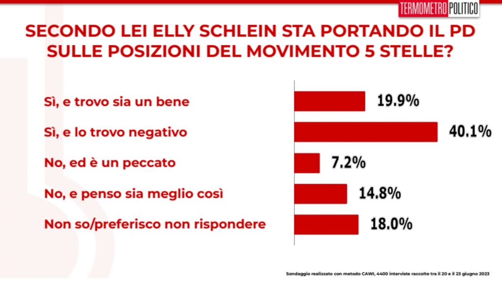 Agli intervistati è stato poi chiesto di commentare alcuni fatti del giorno. Tra questi i rapporti tra il Pd e il Movimento 5 Stelle. Secondo i nostri sondaggi elettorali Elly Schlein sta portando il Pd sulle posizioni dei grillini. La pensa così esattamente il 60% degli italiani, ma solo per il 19,9%, che diventa 45,5% tra chi vota Pd, ciò è positivo. Per il 40,1% è negativo. Vi è un 7,2% che non vede alcun avvicinamento e se ne rammarica e un 14,8% che non lo vede ma ne è contento.