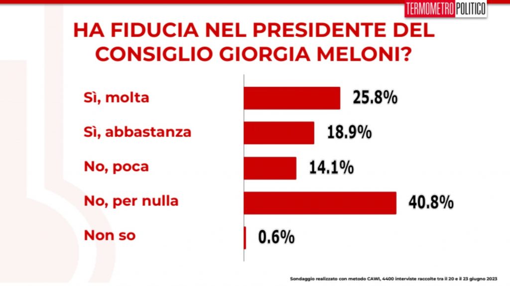 Agli intervistati, come al solito, “Termometro Politico” ha chiesto se hanno ancora fiducia nella presidente del consiglio. La fiducia degli Italiani sembra grossomodo stabile: si parla del 25,8%. Il 40,8% dice invece di non essere per nulla soddisfatto dell’operato della leader di FdI. Un dato a cui si può aggiungere il 14,1% che indica chi invece ha poco fiducia in Meloni a Palazzo Chigi.