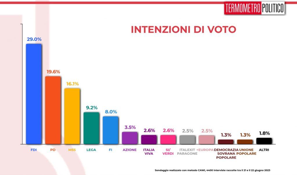 Gli ultimi sondaggi elettorali di “Termometro Politico” dimostrano che Giorgia Meloni ha da preoccuparsi: il primo partito italiano, il suo Fratelli di Italia, perde tre decimali e si porta al 29%. In calo anche Forza Italia, che dall’8,3% va all’8%, forse perché è venuto meno l’effetto Berlusconi (dopo la scomparsa del Cavaliere i voti a favore del partito azzurro erano infatti aumentati in maniera significativa). In leggera crescita (parliamo dello 0,1%) soltanto la Lega, che si attesta al 9,2%. L’opposizione invece è stabile: al 19,6% il Pd e il Movimento 5 Stelle al 16,1%.